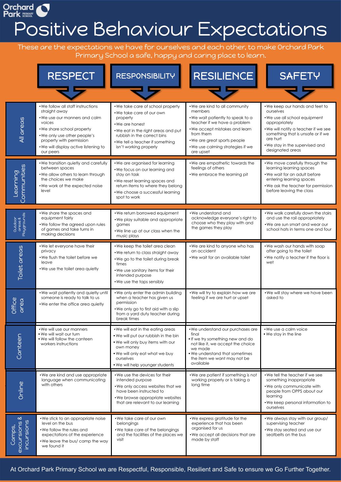 School-wide Positive Behaviour Support (SWPBS) is a framework that unites school communities to cultivate positive, safe, and supportive learning cultures. SWPBS helps schools enhance social, emotional, behavioural, and academic outcomes for children and young people. At our school, students are regularly exposed to our core values and expectations: respect, responsibility, resilience and safety. Through our SWPBS program, we explicitly reteach and model positive behaviours using a positive behaviour matrix developed in collaboration with our students and displayed in each classroom to outline our expectations.