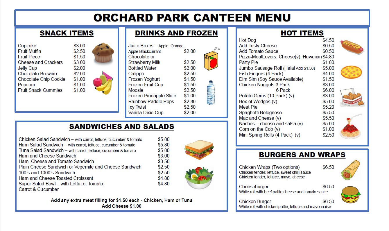 - If the online cut off time is missed, or you prefer to use cash, please write the order out on a paper bag or an envelope (using the attached menu for items available and the pricing) and drop it into the Class pencil cases in the classrooms in the morning.